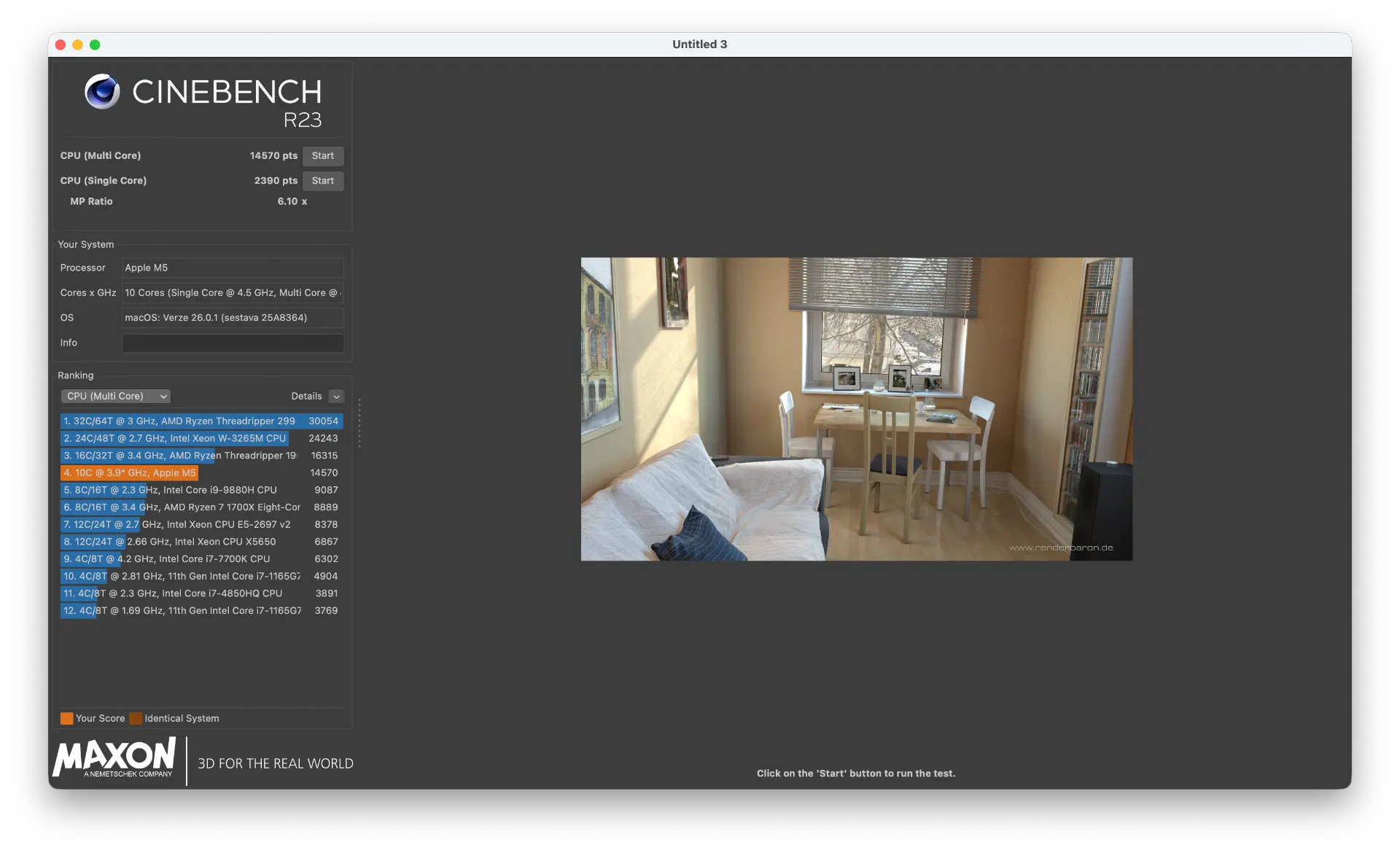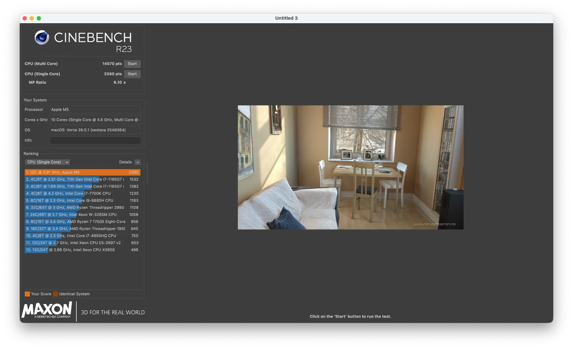 Zdánlivě jedinou novinkou, která letos základní MacBook Pro zasáhla, bylo osazení čipem M5. Od toho se odvíjí vyšší výkon a lepší efektivita. Co to znamená v praxi? Pojďme se nejdříve podívat na benchmark Cinebench, kde v testu zaměřeném na výkon jednojádrový dosáhl laptop výkonu 2 390 bodů, při využití všech jader potom výkon dosáhl na hodnotu 14 570 bodů. Na papíře to nejsou špatné hodnoty, ale samozřejmě je nutné to nějak chladit, aby nemusel být při déle trvajících úlohách výkon uměle omezován.